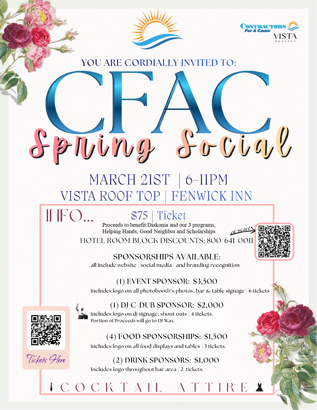 Contractors for a Cause (CFAC) is hosting a Spring Social fundraiser on March 21st at Vista Rooftop at the Fenwick Inn, with proceeds benefiting Diakonia’s Supportive Living Campus Capital Campaign.
