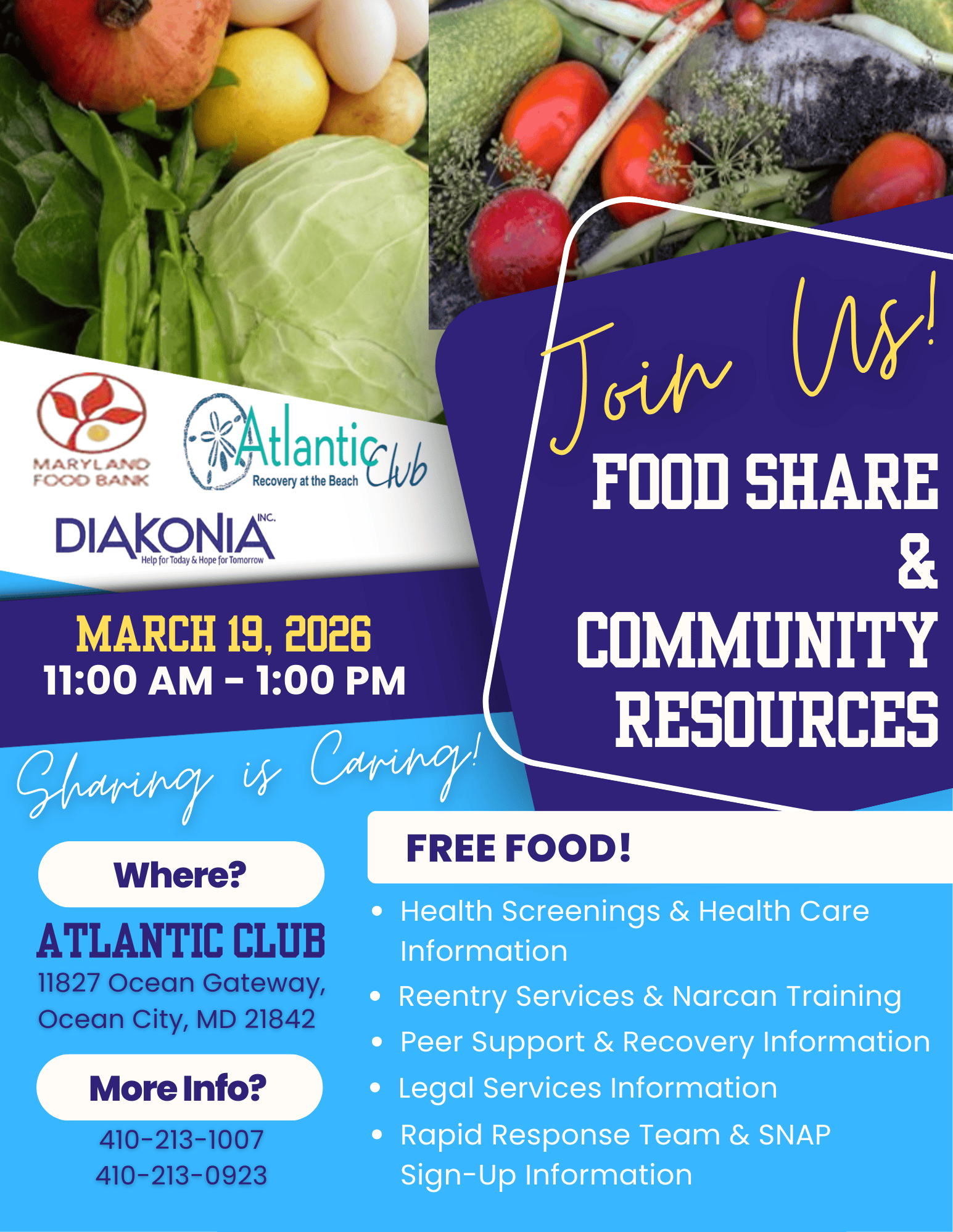 Diakonia is partnering with the Maryland Food Bank and the Atlantic Club for a FREE FOOD Share & Community Resources event on March 19 from 11:00 AM – 1:00 PM at the Atlantic Club | 11827 Ocean Gateway, Ocean City, MD 21842