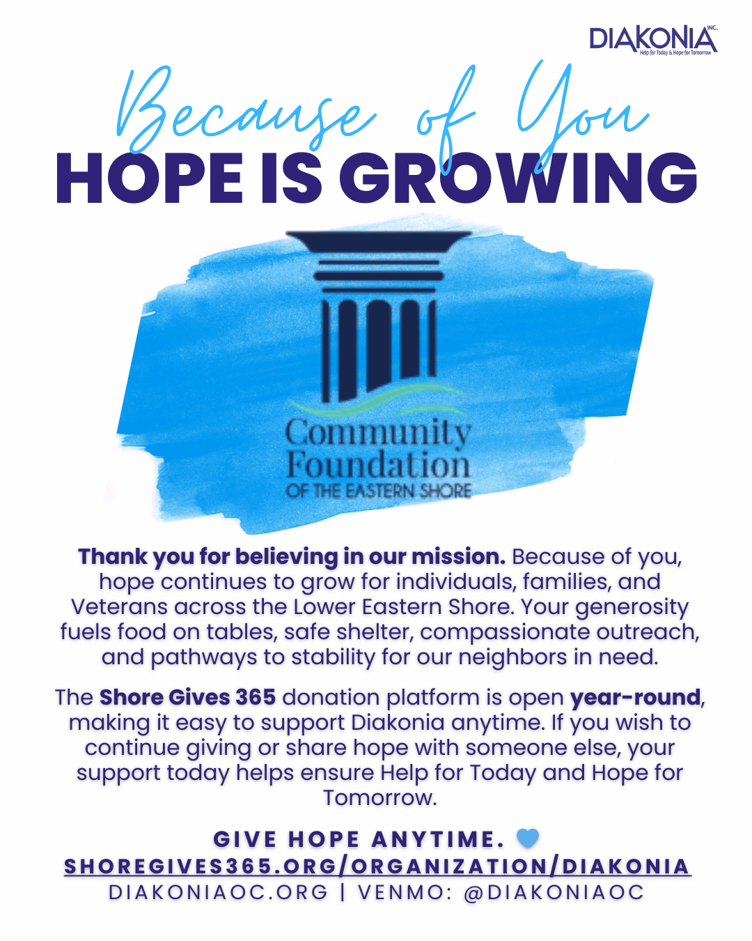 The Shore Gives 365 donation platform, powered by the Community Foundation of the Eastern Shore, is open year-round, making it easy to support Diakonia anytime. Whether you’re inspired by one of our events or simply want to give back, your generosity helps ensure Help for Today and Hope for Tomorrow.