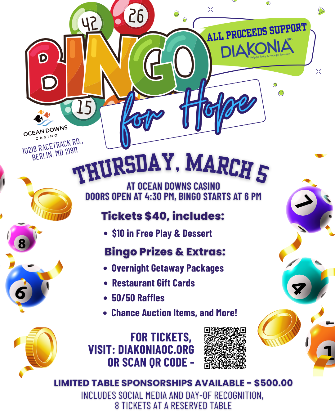 Join us for Bingo for Hope, a joyful night of fun, laughter, and community, all in support of Diakonia, Inc. and the neighbors we serve across Maryland’s Lower Eastern Shore.
